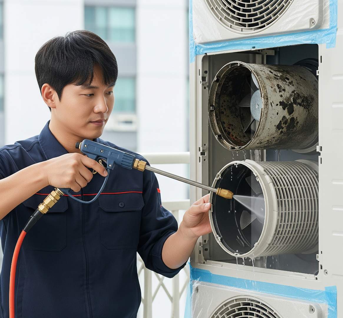 저희는 에어컨을 안전하게 분해하여 내부 열교환기(냉각핀)와 송풍팬에 고착된 곰팡이와 먼지를 친환경 전용 약품으로 불린 후, 고압 세척 장비로 강력하게 세척하여 악취와 유해균의 근원을 완벽하게 제거합니다.