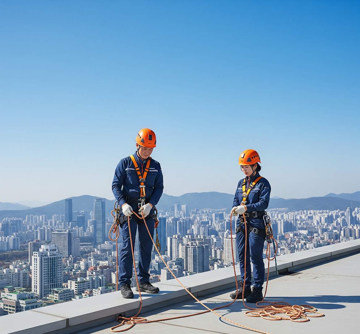 저희는 고층 건물 외벽 청소를 위한 전문 로프 기술(자격 보유)과 고소 장비 운용 능력을 갖춘 베테랑팀으로 구성되어 있습니다.